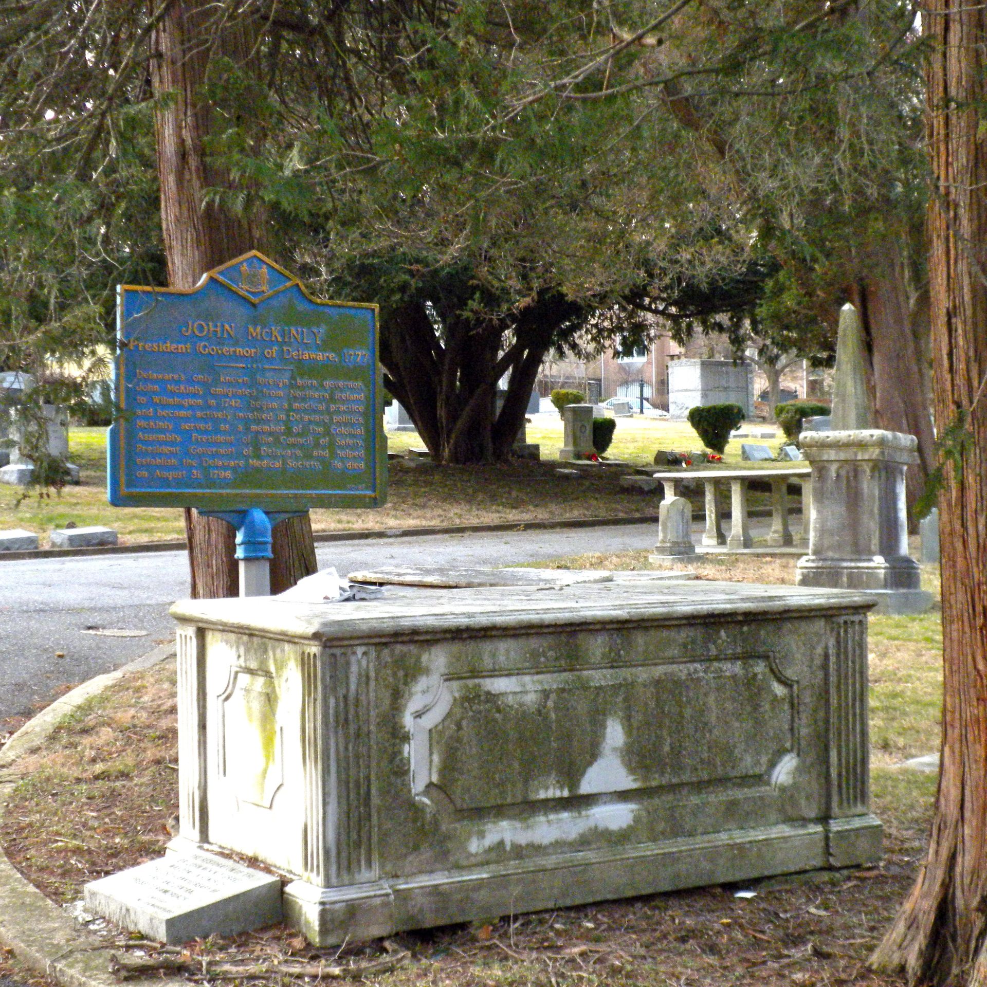 In February 1777, the General Assembly decided that an executive was necessary and elected John McKinly to serve as the first president of Delaware (equivalent to the role of governor). He was a consensus candidate to please both the conservative and radical factions of the state’s independence movement. Due to disaffection over the Revolutionary War, he was not able to accomplish much of note during his term. In September 1777, he was captured by the British army and imprisoned on the HMS Solebay , which marks the end of his presidency. He refused to serve as a delegate to Congress after the war and instead founded the Delaware Medical Society. John McKinly died on August 31, 1796.
