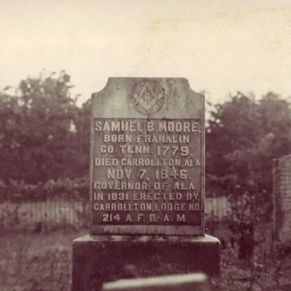 SAMUEL B. MOORE was born in Davidson County, North Carolina, which is present day Franklin County, Tennessee. As a young child, he moved with his parents Matthew and Letita Moore to Jackson County, Alabama. Moore, who had a limited education, became a planter in Alabama. In 1823 he was elected to the Alabama House of Representatives and was a member of the Alabama Senate from 1828 to 1831. He was serving as president of the senate in March 1831, when Governor Gabriel Moore, resigned from office to take a seat in the U.S. Senate. During his short time as governor, Moore was mainly concerned with carrying out the policies his brother had started. This included the startup of the state’s first railroad and the opening of the University of Alabama. He was an avid supporter of the State Bank of Alabama and was opposed to nullification. Moore ran for reelection in 1831, but was defeated soundly by John Gayle. After leaving office in November 1831, Moore returned to his home in Pickens County, where he was elected again to the Alabama Senate from 1834 to 1838. He later served as judge in the Pickens County Court (1835-1841). He died on November 7, 1846, and is buried at Carrollton City Cemetery, Carrollton, Alabama.